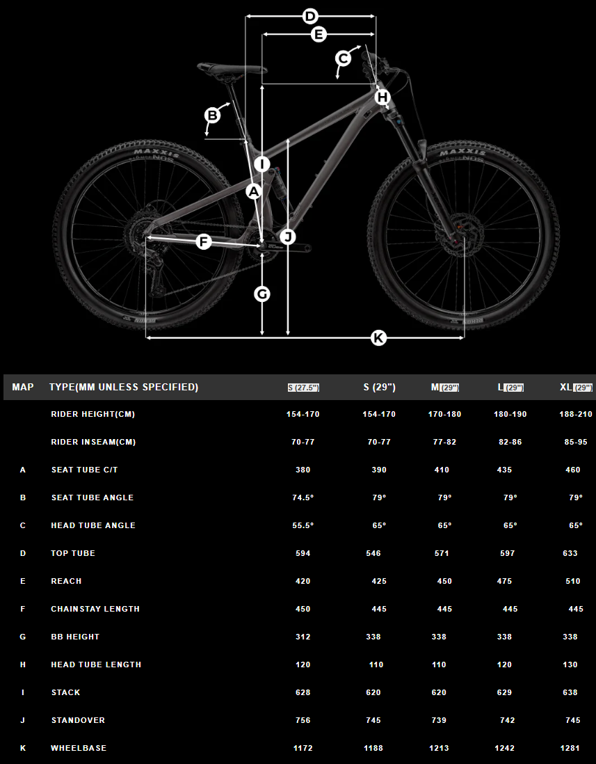 | FRAME | Alloy Trail Dual suspension Frame. True single pivot design, 140mm Rear Travel with 185x52.5mm Trunnion Shock. 30x8mm hardware. BSA Bottom Bracket. Boost 148 |