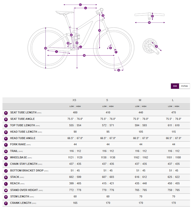 | Crankset | SRAM GX Transmission, 34t, 55mm chainline XS - 165mm, S - 170mm, M - 170mm |
